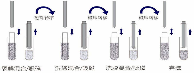 采用磁珠分离技术,选择相应的试剂盒就可以自动地从多种样品材料如血液、组织、细胞中分离纯化高纯度的核酸。